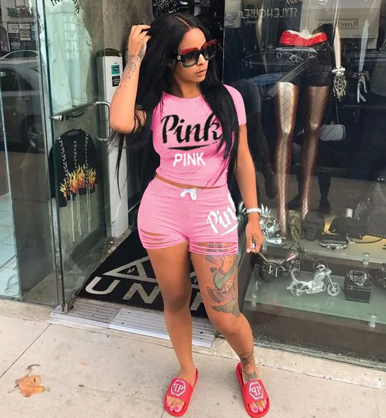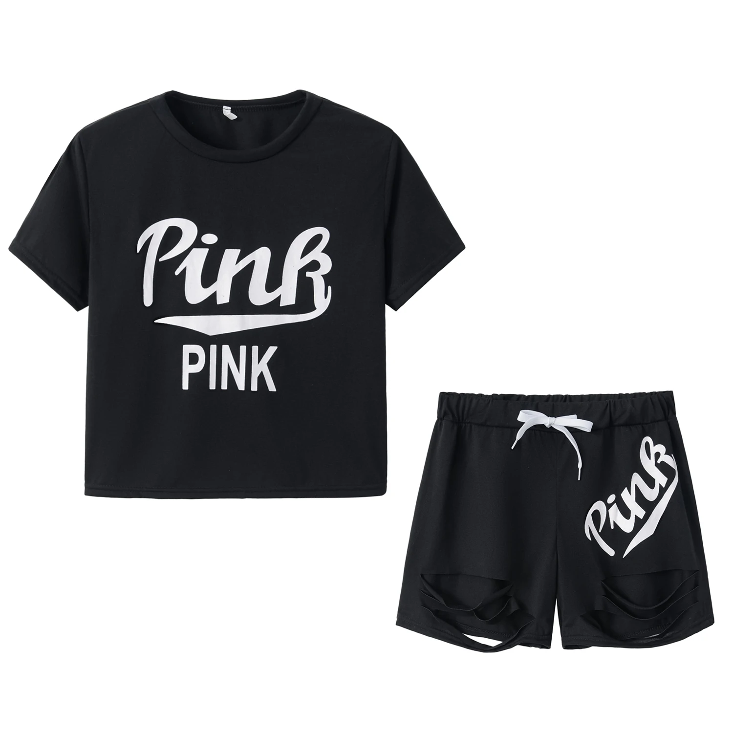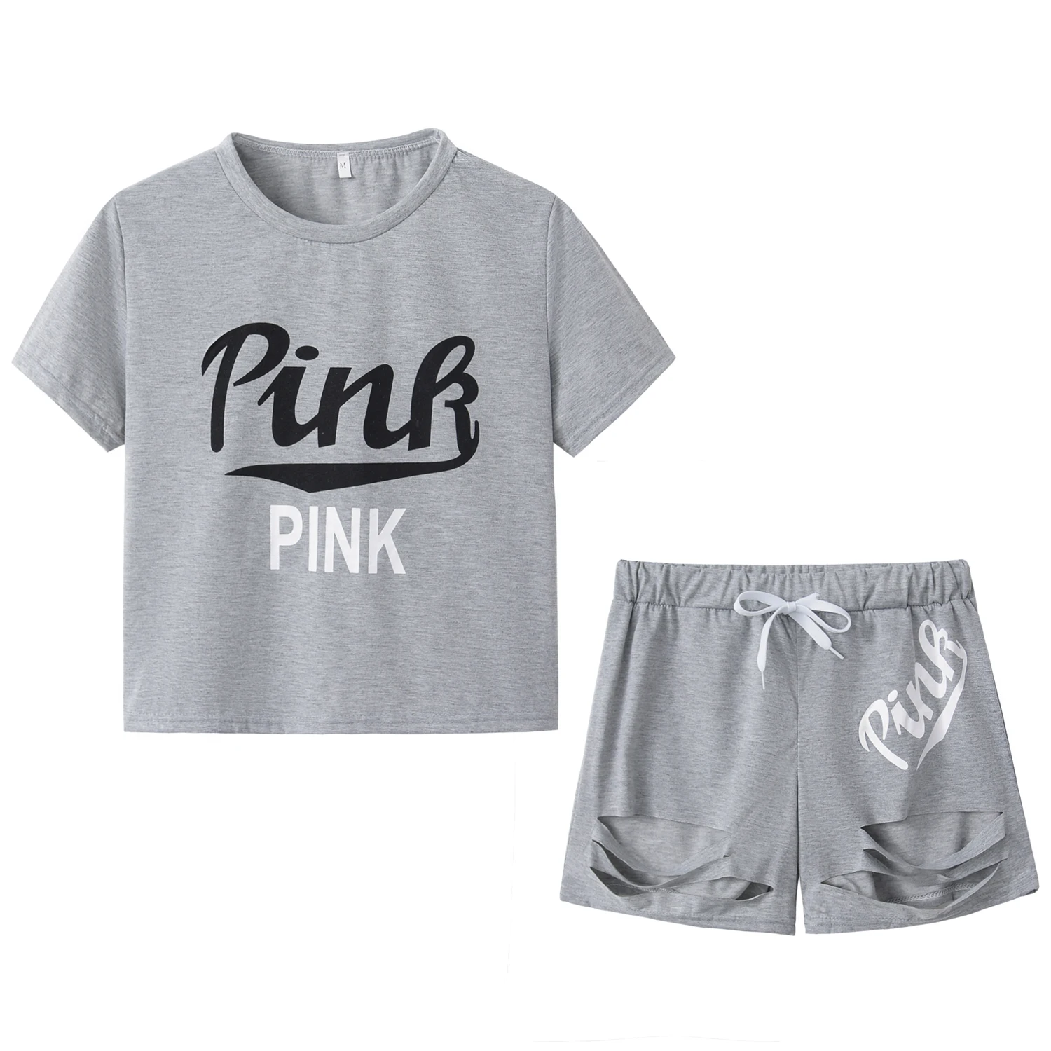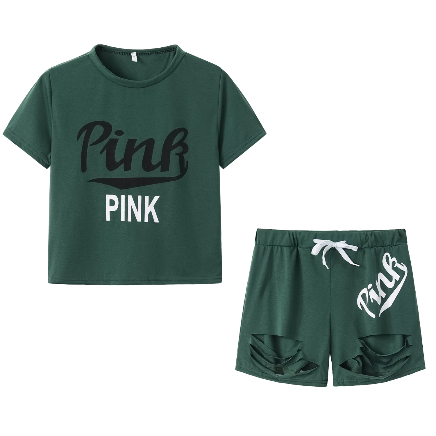 Hot Selling European & American Women's Summer Pink Letter Print Shorts Set