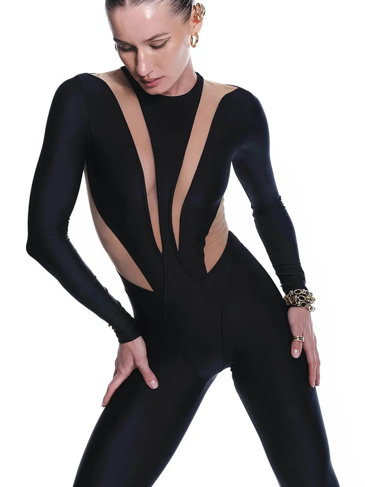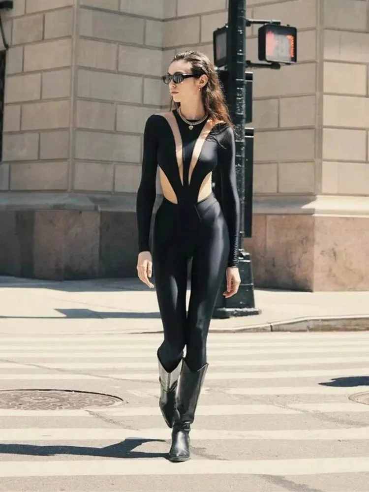 Step up your fashion game with this sleek and modern skinny-fit jumpsuit, designed for those who love bold, high-street fashion. The patchwork detailing adds a unique touch, making this piece a standout choice for both casual outings and night events.