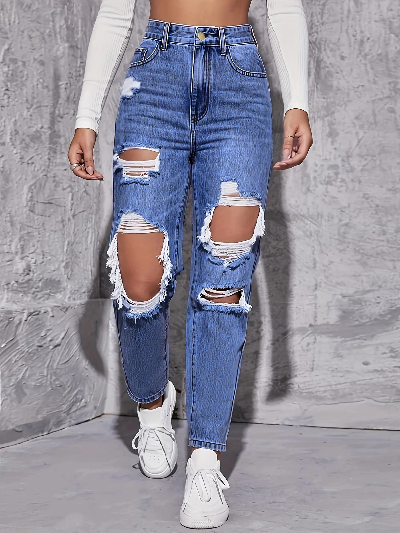 American Retro Hole-punched Jeans Women High Waist Straight-crotch Loose Slim Design High-street Vibe Wide-legged Dragging Pants