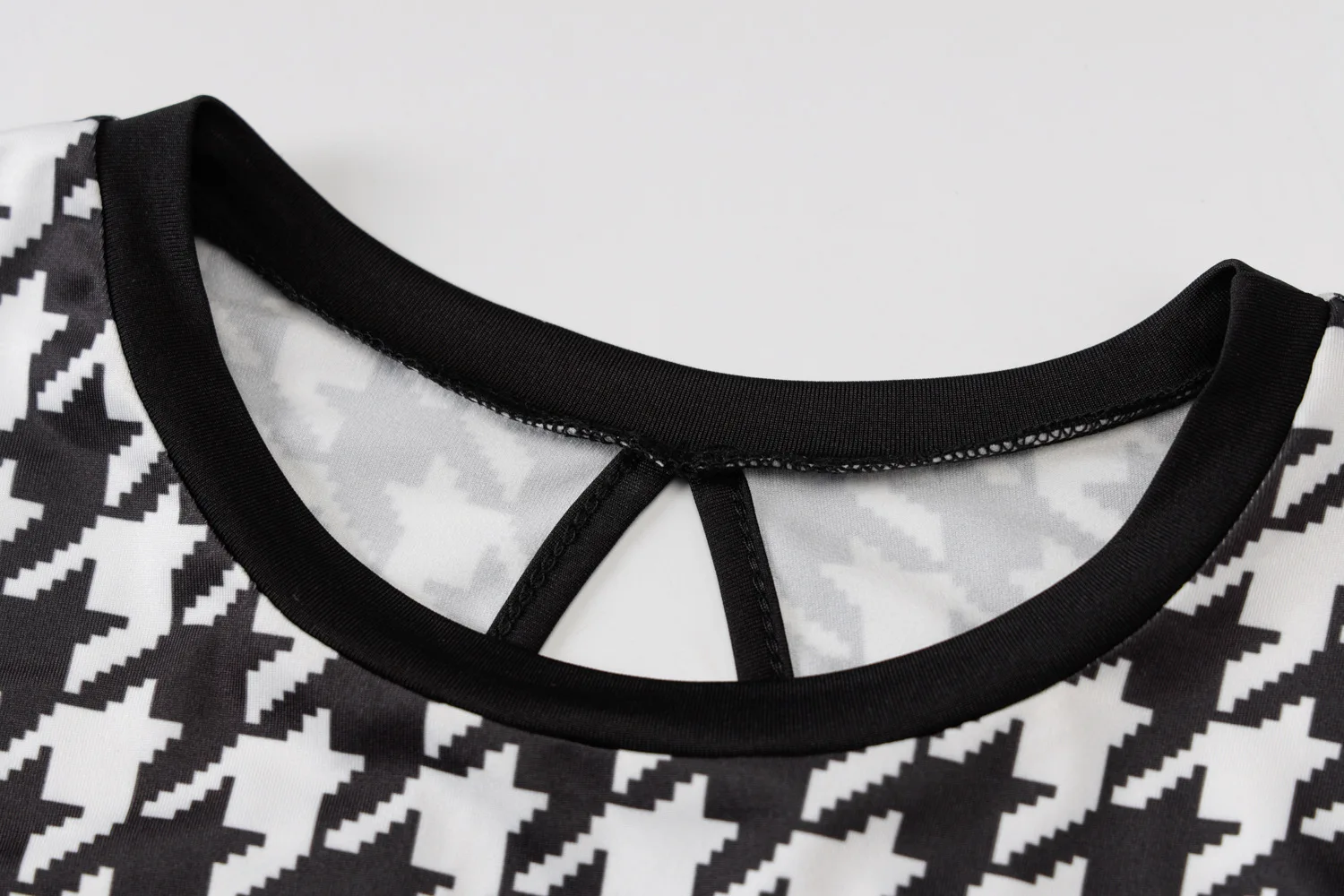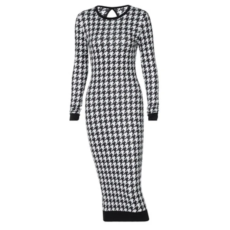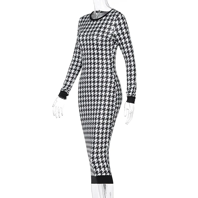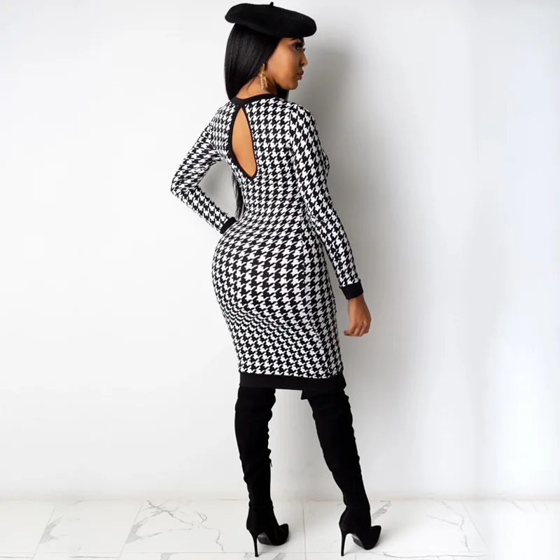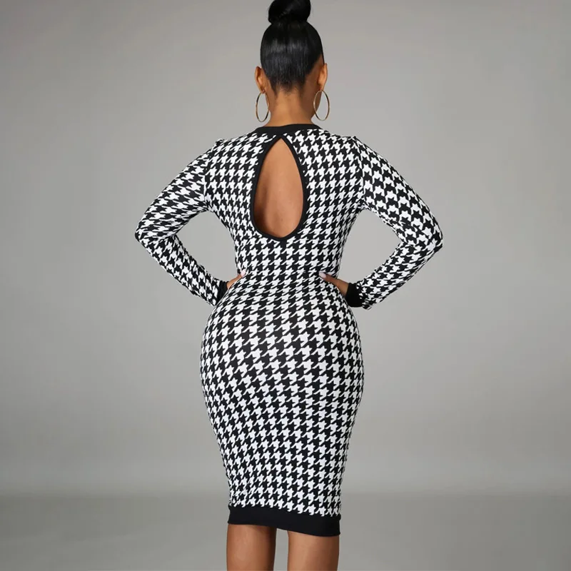 Elegant Houndstooth Print Bodycon Dress – Women's Long-Sleeve Hollow-Out Midi Dress for Autumn & Winter Streetwear