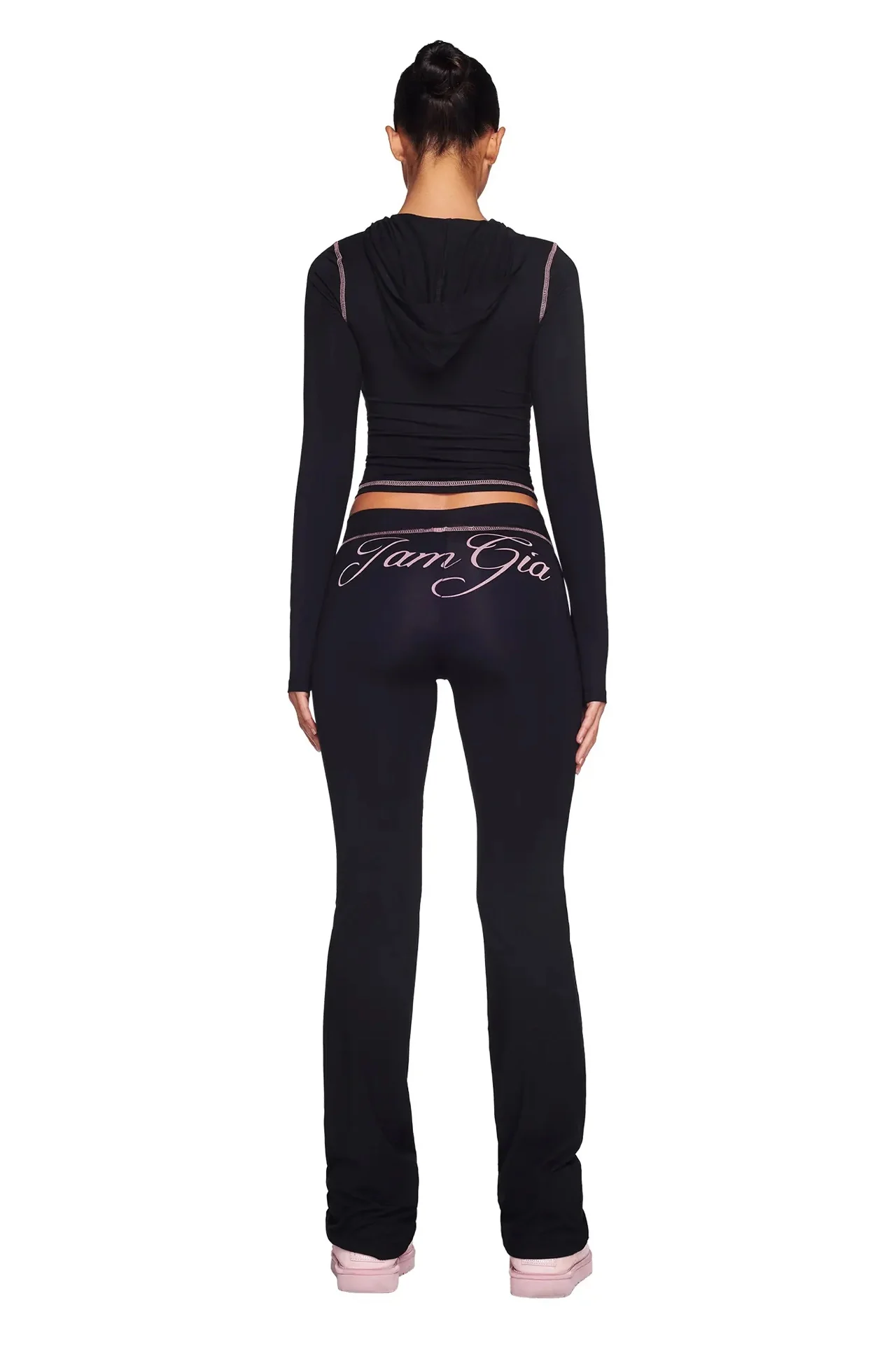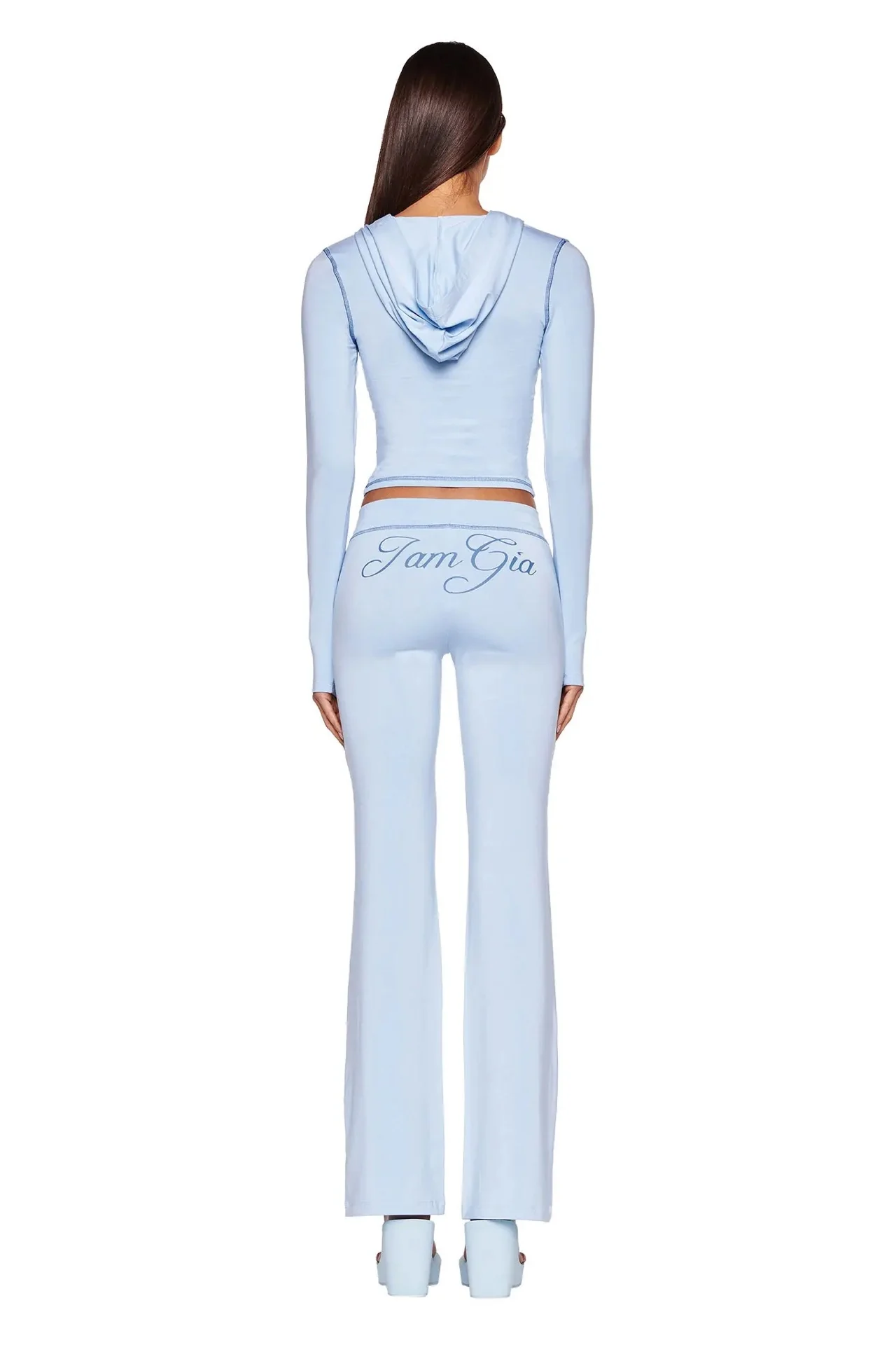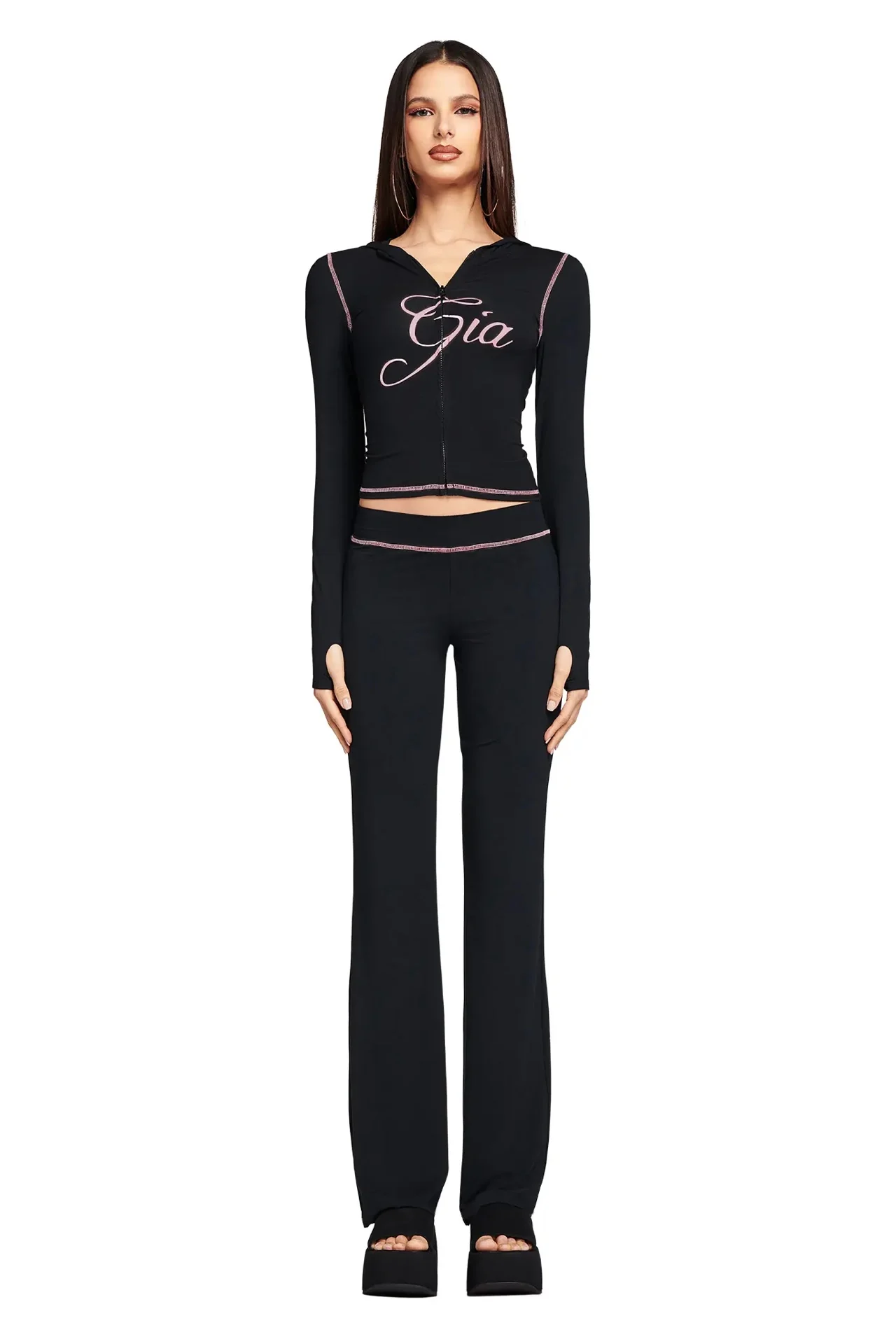 Iamgia Zip-Up Cap Long Sleeve Top & Low Waist Micro Flared Pants