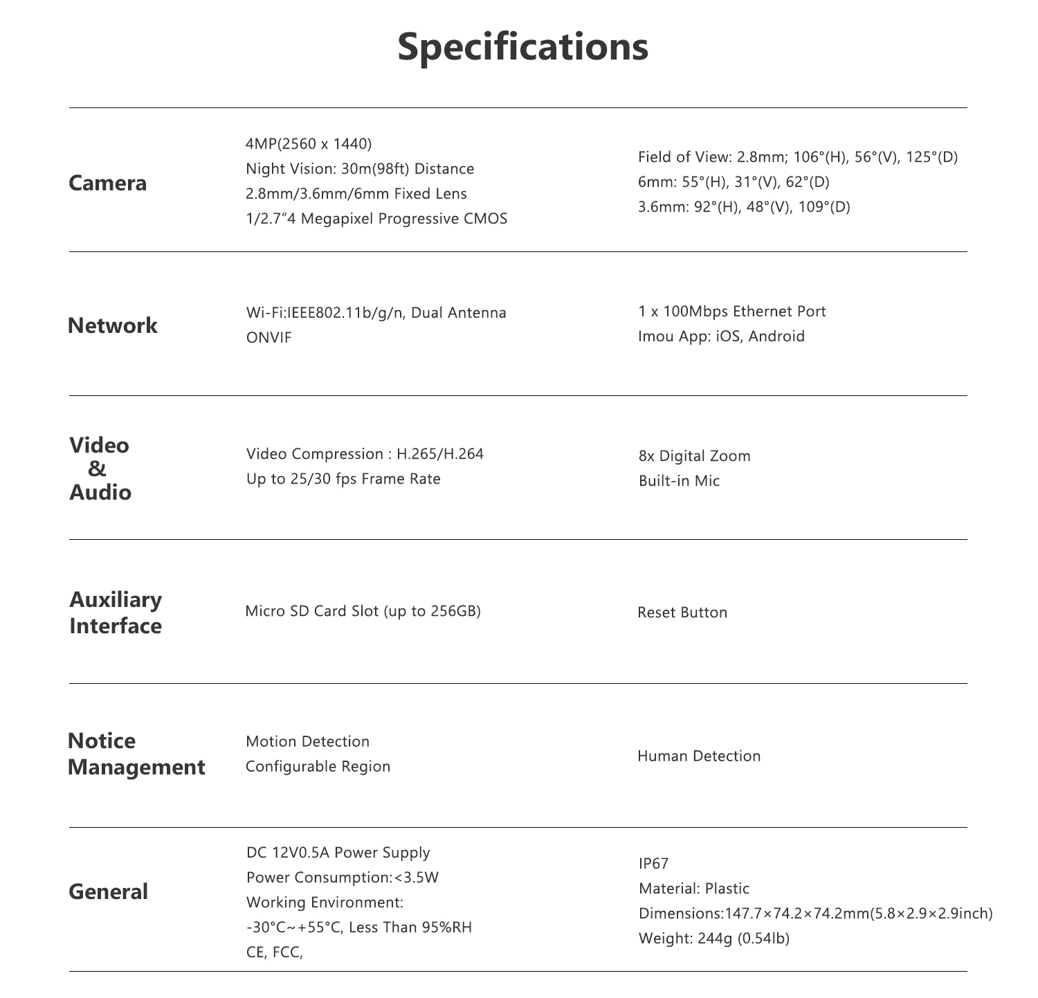 - Lens Options: 2.8mm, 3.6mm, 6mm