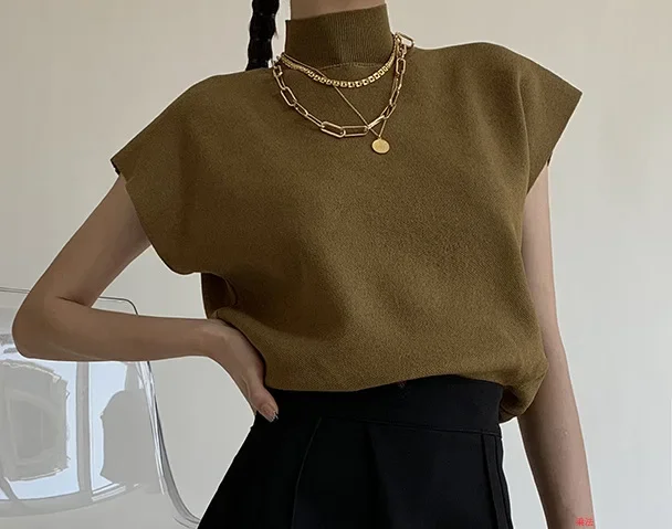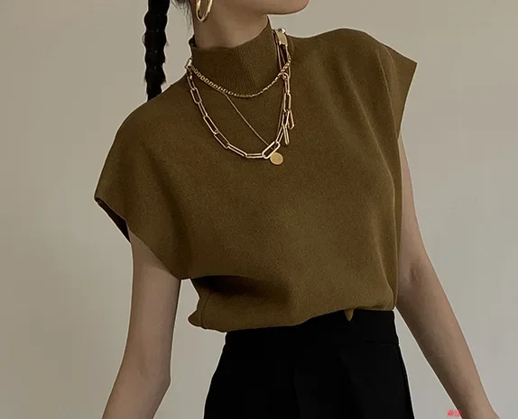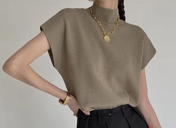 Elevate your wardrobe with this elegant hollow-out knitted sleeveless blouse, designed for a chic and sophisticated spring/summer look. Featuring a stand collar and loose fit, this pullover top is perfect for achieving a refined yet relaxed office or casual style. The hollow-out knit pattern adds a touch of femininity, making it an excellent choice for layering or wearing alone.