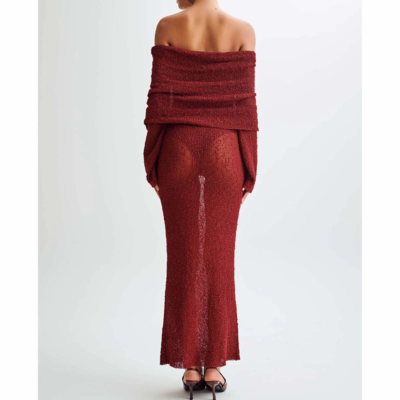 Syiwidii Elegant Off-Shoulder Knit Dress – Long Sleeve Sexy See-Through Evening Dress for Women