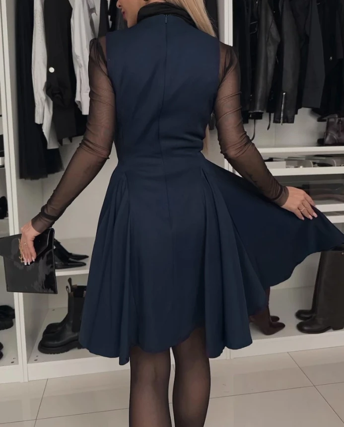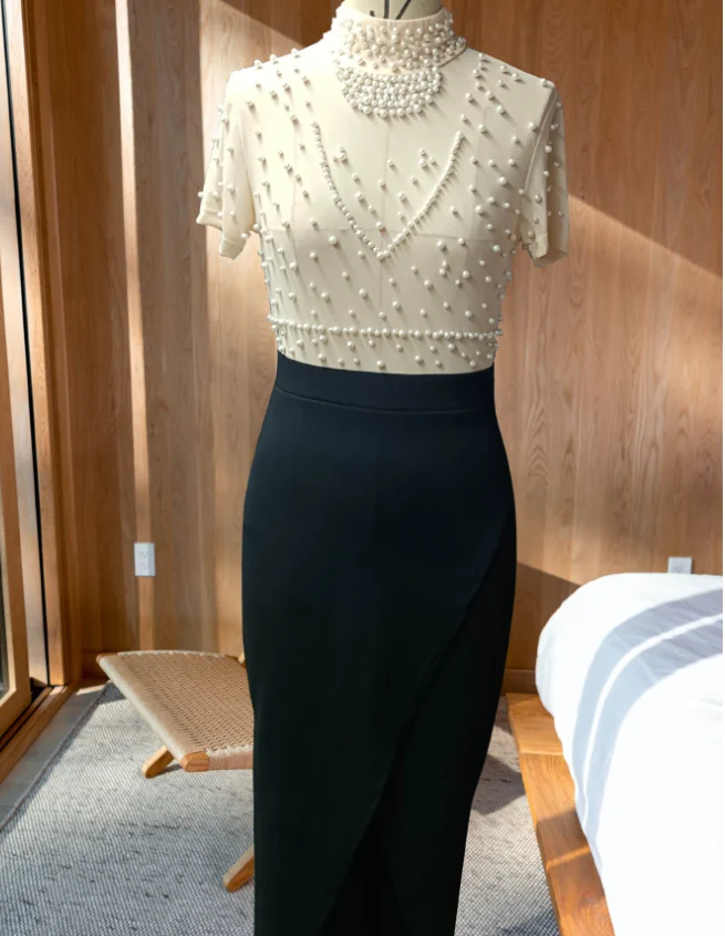 Its mid-calf length and short regular sleeves balance sophistication with comfort, while beaded mesh panels and patchwork accents add texture and glamour. The O-neckline frames the collarbone gracefully, enhancing the chic style of the piece.