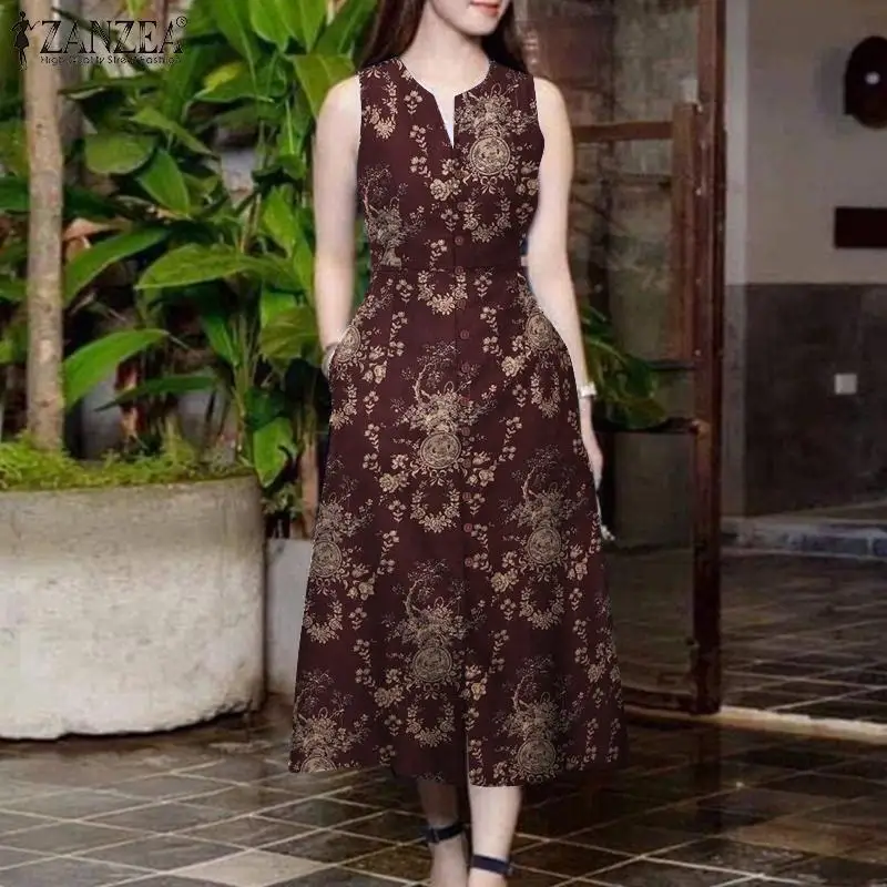 ZANZEA Bohemain Printed Dresses Vintage Sundress Women Summer V Neck Sleeveless Dress Robe Femme Elegant Party Work Vestidos